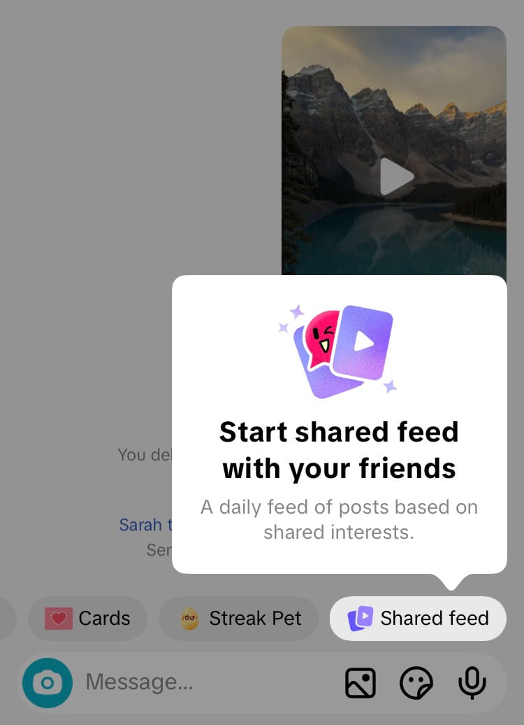 A shared feed on TikTok is a custom feed viewable by 2 people. Every day both members are plated up the same curated selection of 15 videos in their private chat, which is shaped by the videos they both already love. This feed reflects the combined interests of the viewers, meaning that if you and a buddy obsess over fishing videos, similar videos are likely to pop up in the shared feed. Similarly, if you’ve got a brain for business content or an eye for the latest fashion trends, and your fellow shared feed member matches these particular interests, you’re likely to be shown content that aligns with these preferences and topics in your shared feed. TikTok decides on your tailored feed based on the content you both watch and interact with on TikTok.