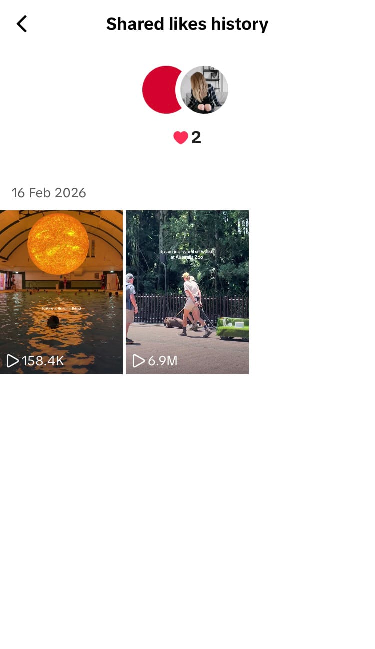 When both members of a shared feed like the same post, TikTok celebrates it! As you both like more of the same posts within your shared feed, a shared likes history dashboard brings all your liked posts together as a cache of memories featuring your shared interests. Explore your shared likes history when you hit the end of your daily shared feed, and return to it at your leisure.