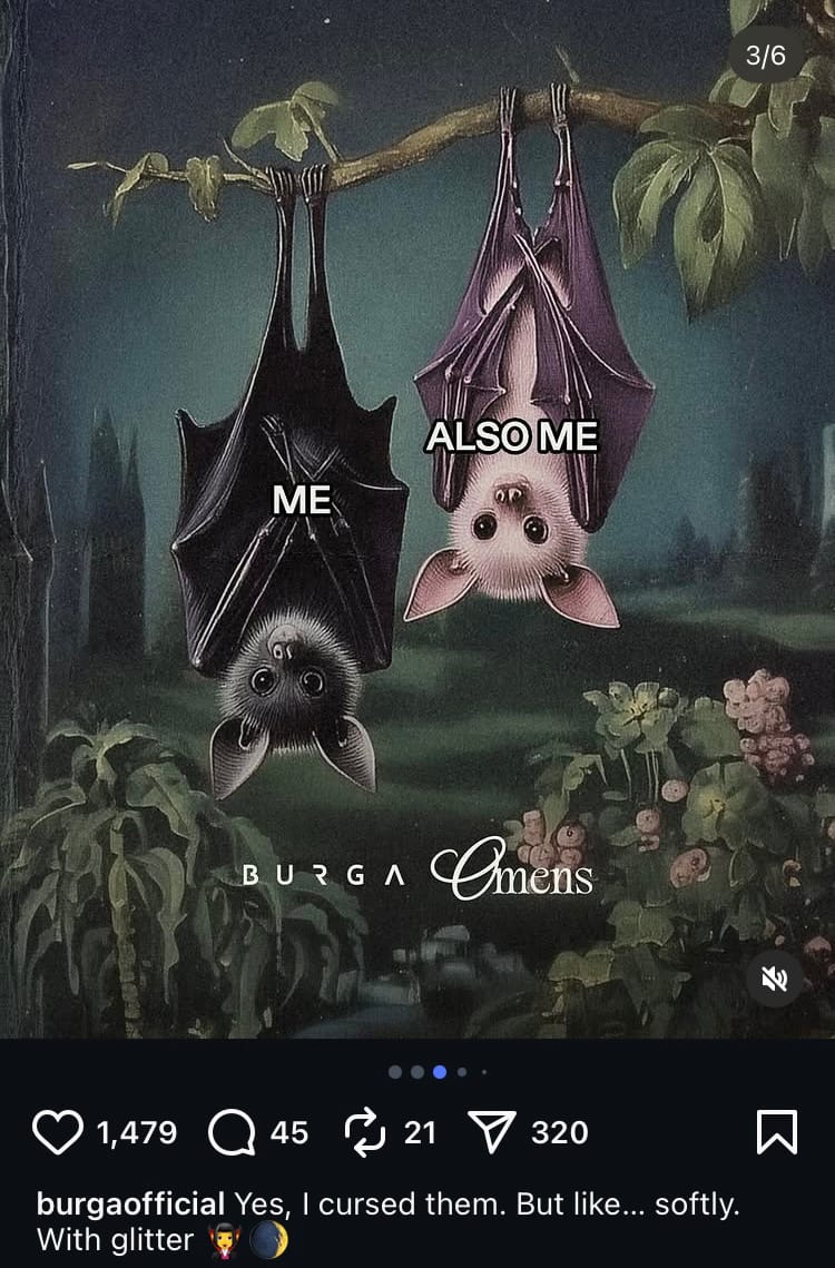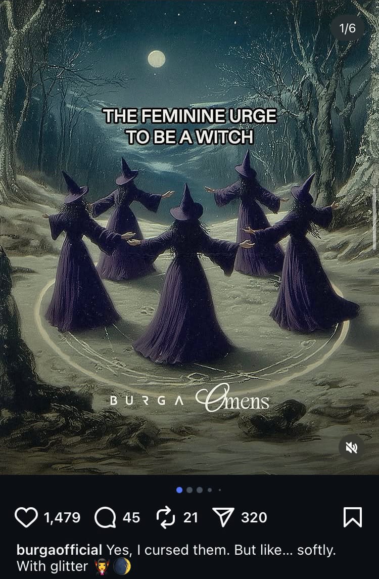Wake up and choose violence by crafting some cursed memes. Wielding themes of witchcraft, wild womanhood and wickedness, @burgaofficial twists popular phrases into terrifying scenes, delivered on a broomstick with plenty of glitter.