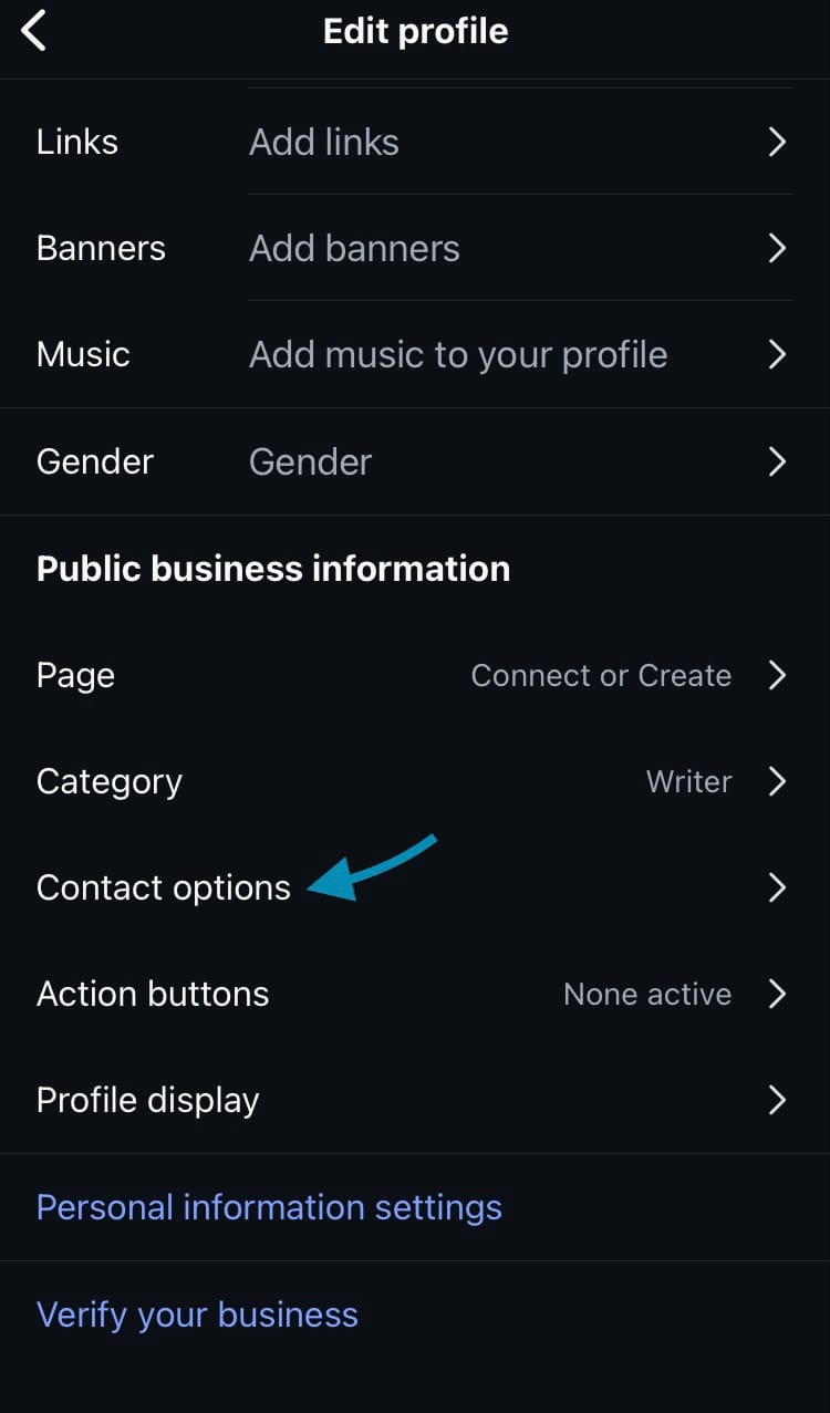 - Scroll down and choose ‘Contact options’ under ‘Public business information’.