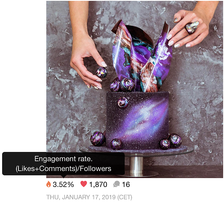 Engagement rate of a single Instagram post is calculated as the sum of likes and comments divided by the number of followers you had at the time of the post publication.