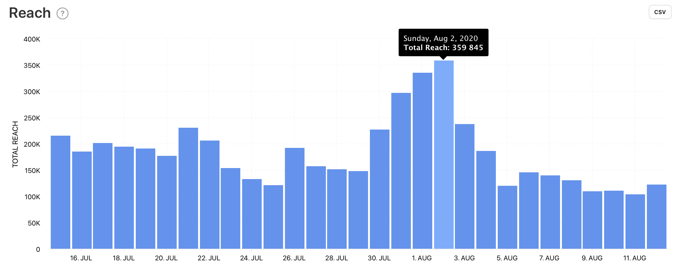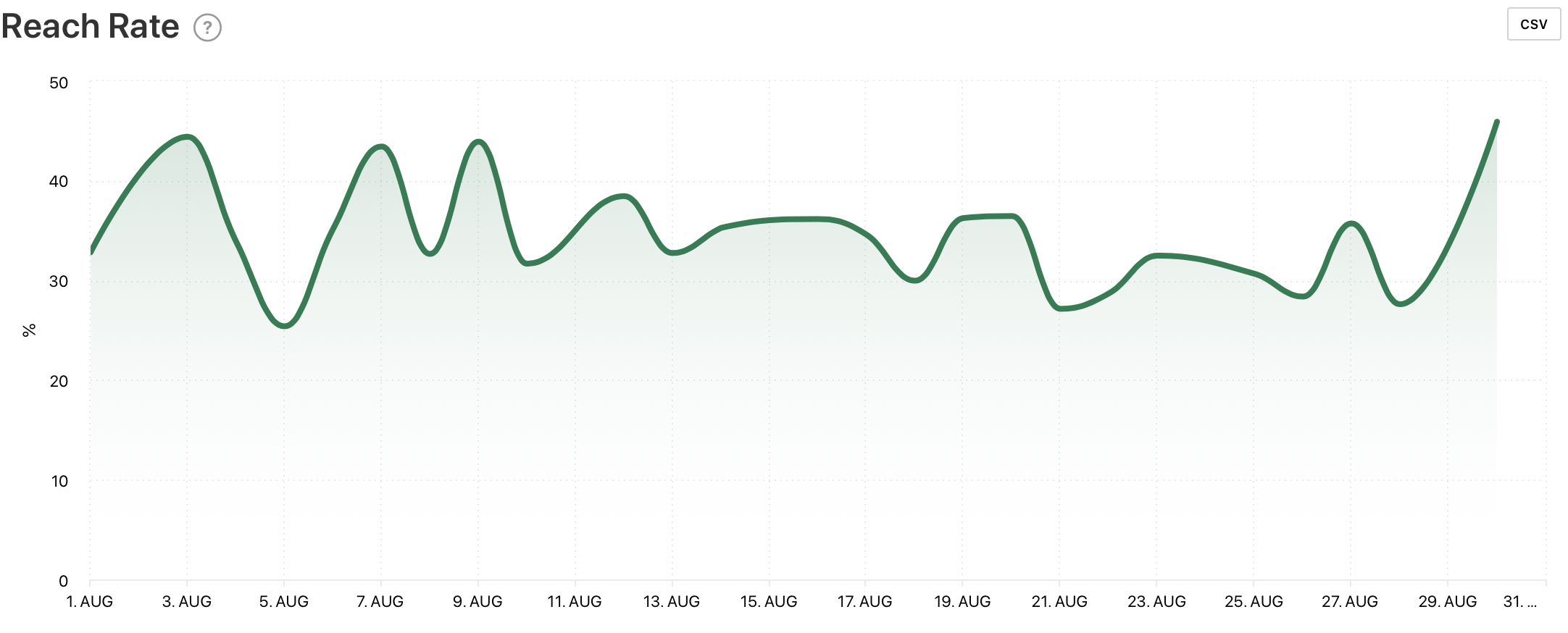 Please note that, unlike other metrics, the Reach graph does not show data related to Posts published on a given day. Instead, it reports when Reach was gained, regardless of the publication date of the posts.