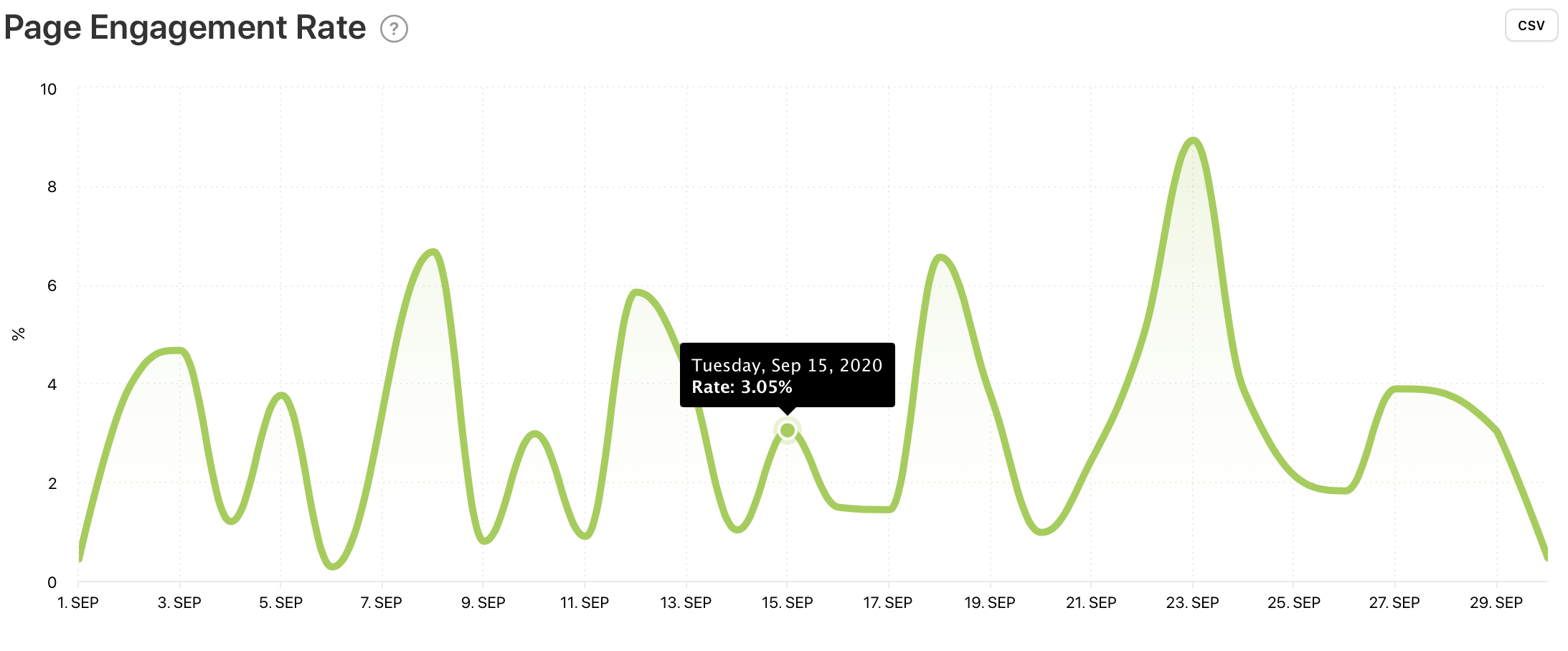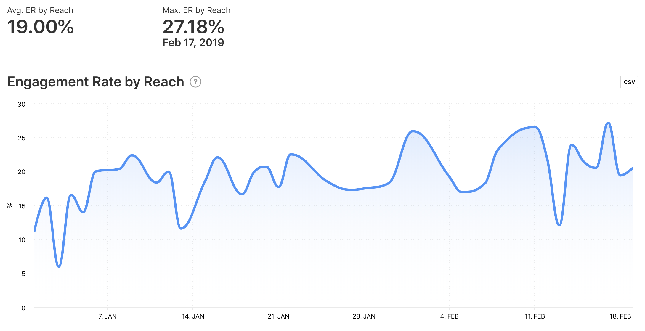 The sum of all Likes, Comments and Shares divided by Reach. The graph shows the average Engagement Rate by Reach of Posts published on a given day during the selected date range.
