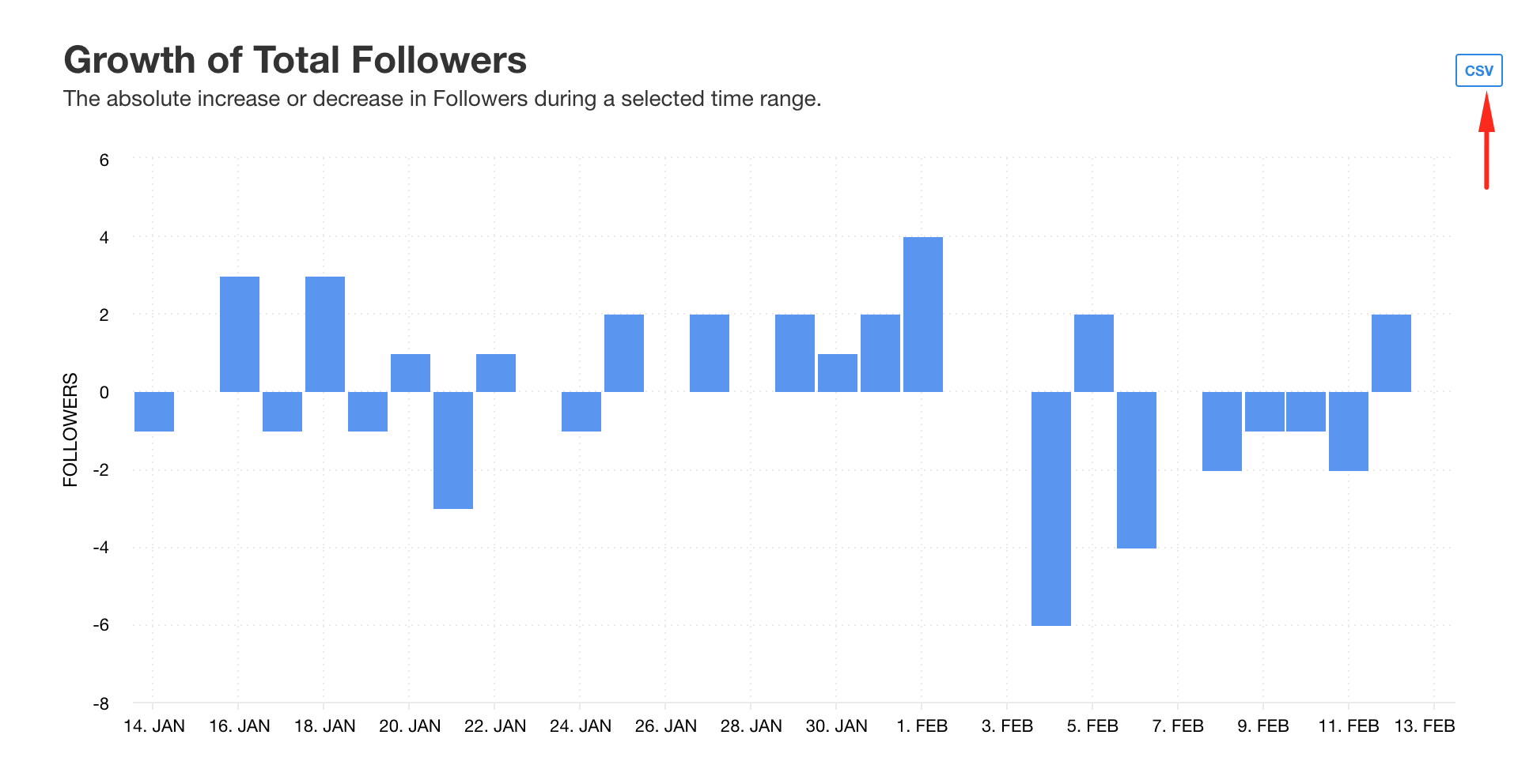 Go to the metric you want to export and click the 'CSV' button located on the right-hand side of each metric.