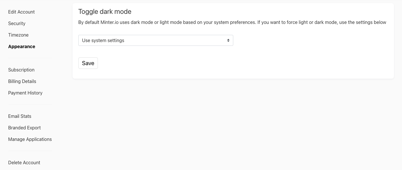 The appearance of Minter.io can be set to either Light or Dark mode in your account settings at https://minter.io/app/edit/appearance. By default the appearance is based on your current system settings.