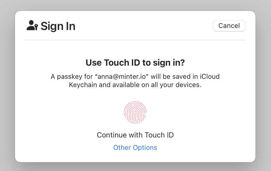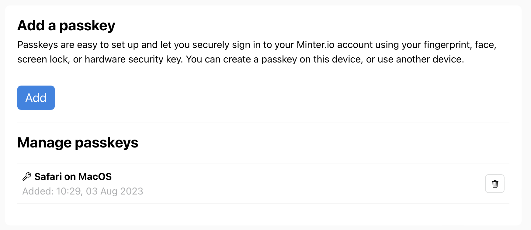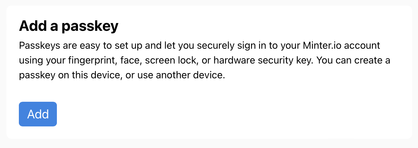 If you are accessing Minter.io from an eligible device and browser, you can add passkeys to your account from your account settings: