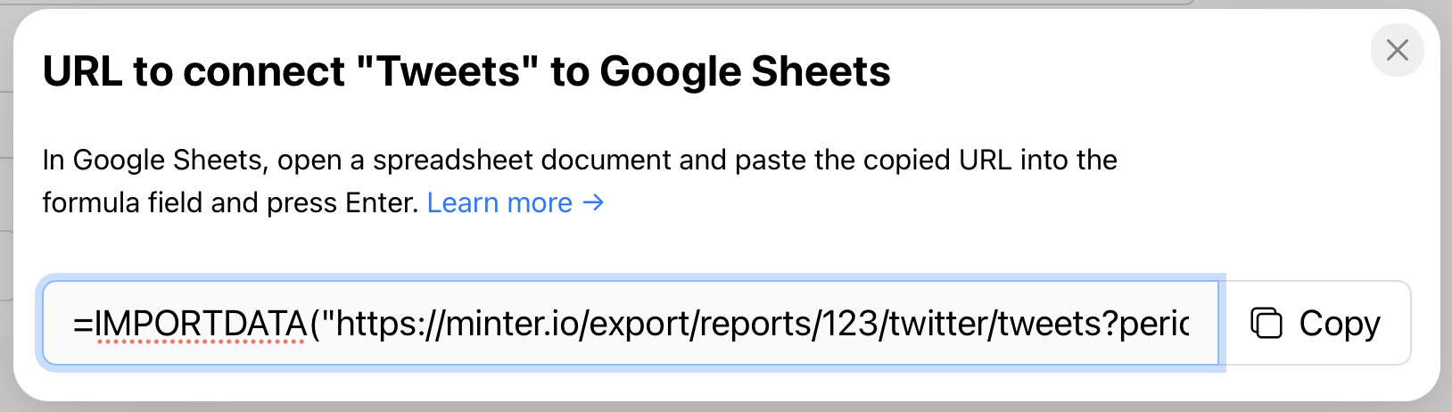 You can easily import your Minter.io data into Google Sheets. Once connected, your data in Google Sheets will be refreshed automatically.