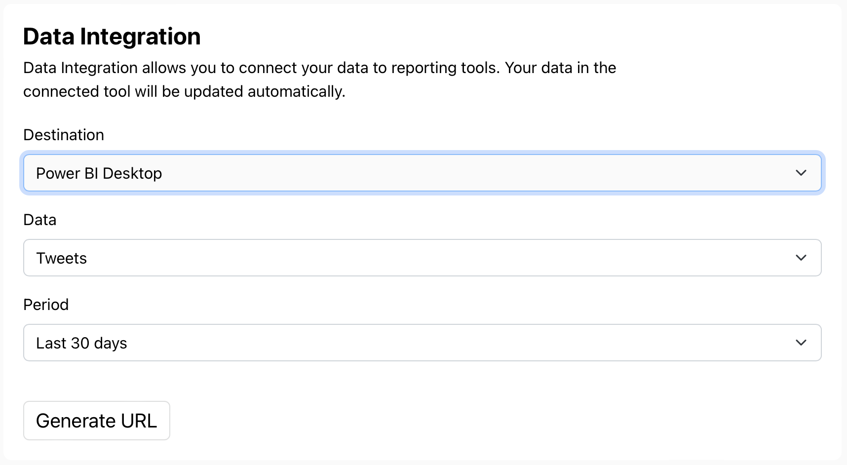 3. Select Power BI from the Destination drop-down. Then, select the data and period you'd like to connect.
