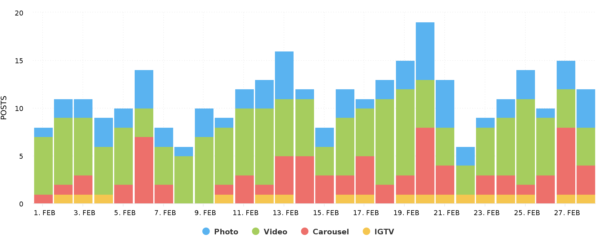 It allows you to easily track how may posts were uploaded, which type of content it was and when it was added. Note: If no posts were published on certain days, no data will be available for that date period.