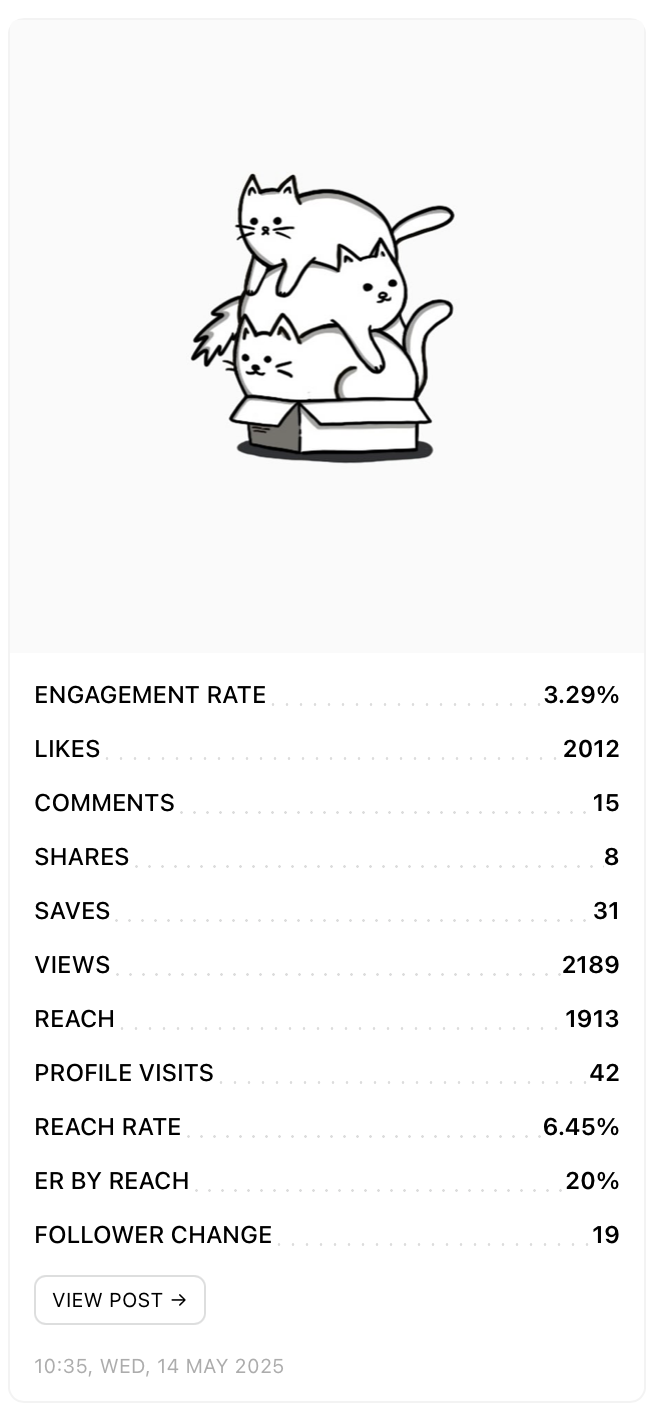 Detailed data for each of your Post published during the selected date range. Posts can be sorted by Engagement Rate, Interactions, Likes, Comments, Reach, Reach rate, Views, Saves, Shares, Profile Visits, Average Watch Time (Reels), Engagement Rate by Reach, and Follower Change.