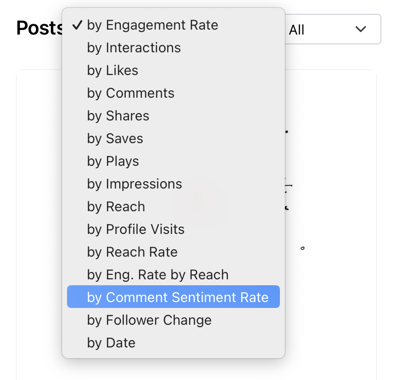 The Comment Sentiment graph, available in the Posts section for Instagram, displays the average sentiment of all posts published within a selected period. Additionally, the sentiment rate for individual posts can be viewed by selecting this option from the sorting drop-down menu.