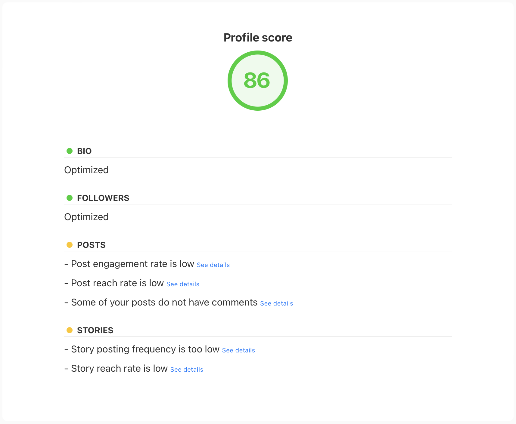 Instagram Audit includes an overall audit score for your profile and a detailed report on Instagram bio optimization, audience activity, post and story optimization and engagement. Learn more about how Instagram Audit works here.