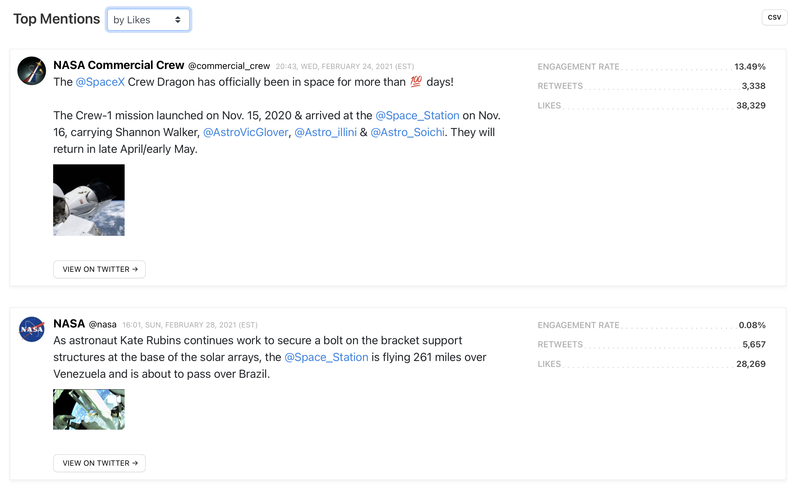 Detailed data for all individual Mentions published during the selected date range. You can filter Top Mentions by Engagement Rate, Retweets, and Likes.