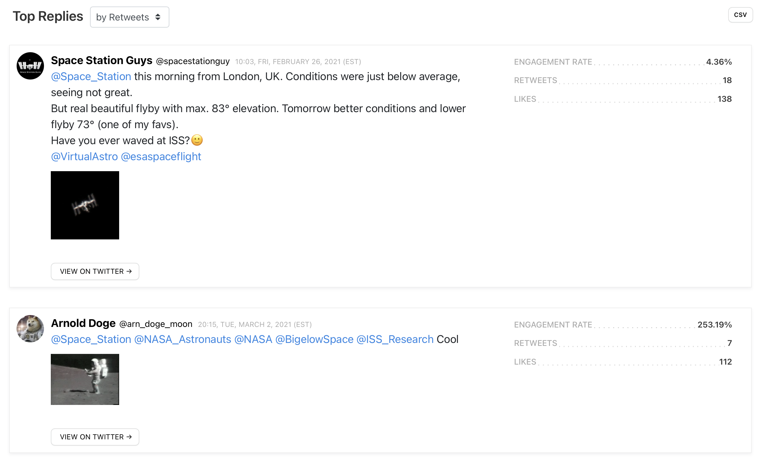 Detailed data for all individual Replies published during the selected date range. You can filter Top Replies by Engagement Rate, Retweets, and Likes.