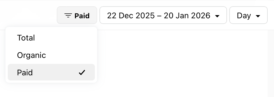 Use the Data Filter located next to the date picker in the Posts tab to switch between Total, Paid, and Organic data views. The Data Filter lets you control how your metrics are displayed, so you can see total, organic only, or paid only data for all your posts for the selected date range.